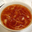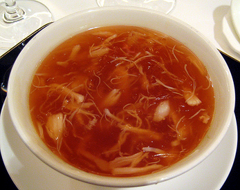 The bowl of shark fin soup is served. It sits in a white porcelain bowl in an orangey almost brown juice but that could just be because of the lighting.